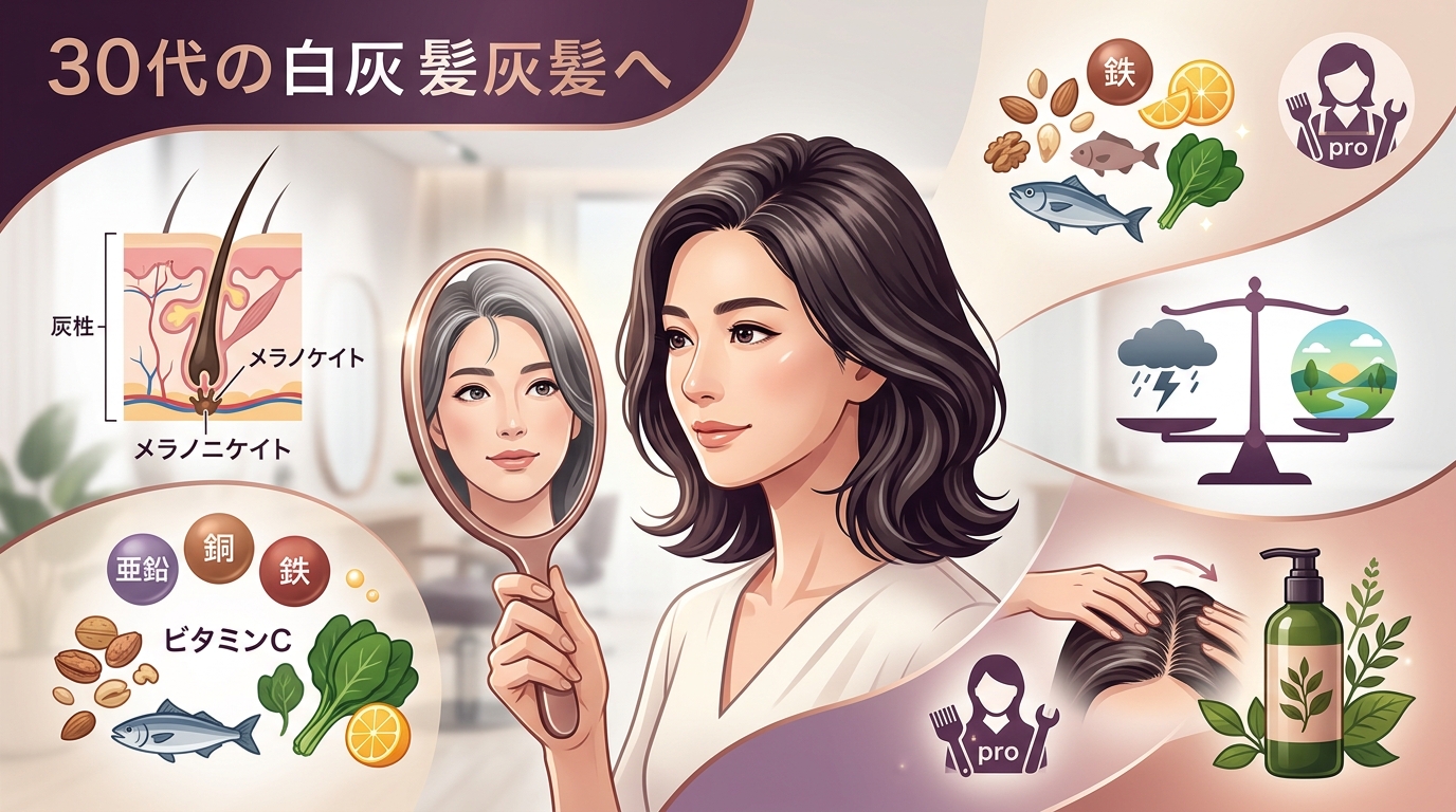 30代前半での白髪の増え始めは、遺伝的素因に加えて、ストレス、不規則な生活習慣、栄養不足などが複合的に影響していることが多いです。