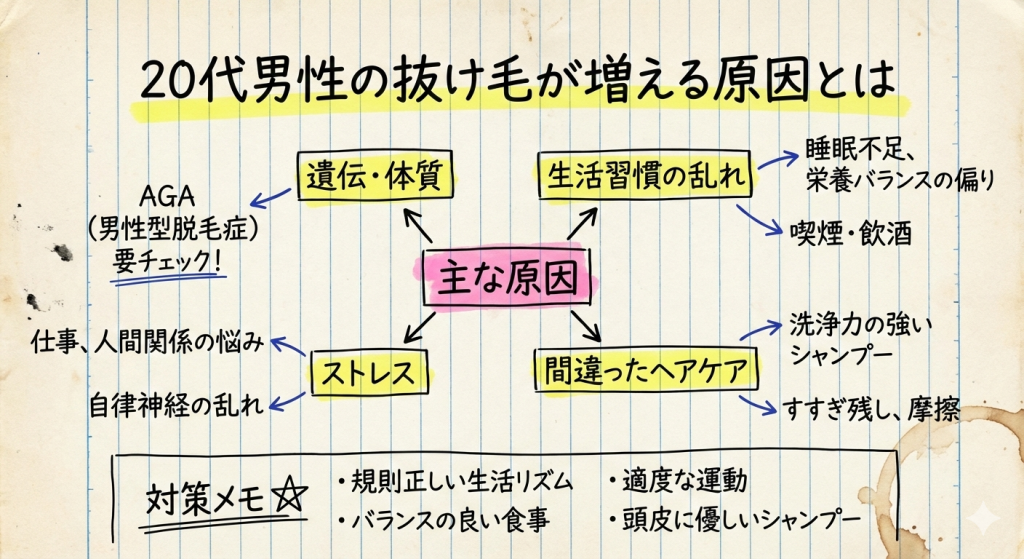20代男性の抜け毛対策シャンプーを選ぶ前に、まずは抜け毛の原因を正しく理解することが重要です。原因を知らずに対策をすると、効果が出にくくなります。