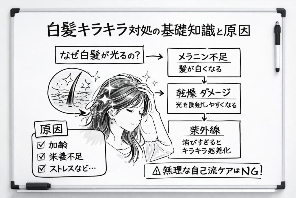 白髪キラキラ対処を正しく行うためには、まず白髪がなぜ光るのかという基本構造を理解することが重要です。原因を知らずに対策をしても、効果は一時的になりやすいのです。