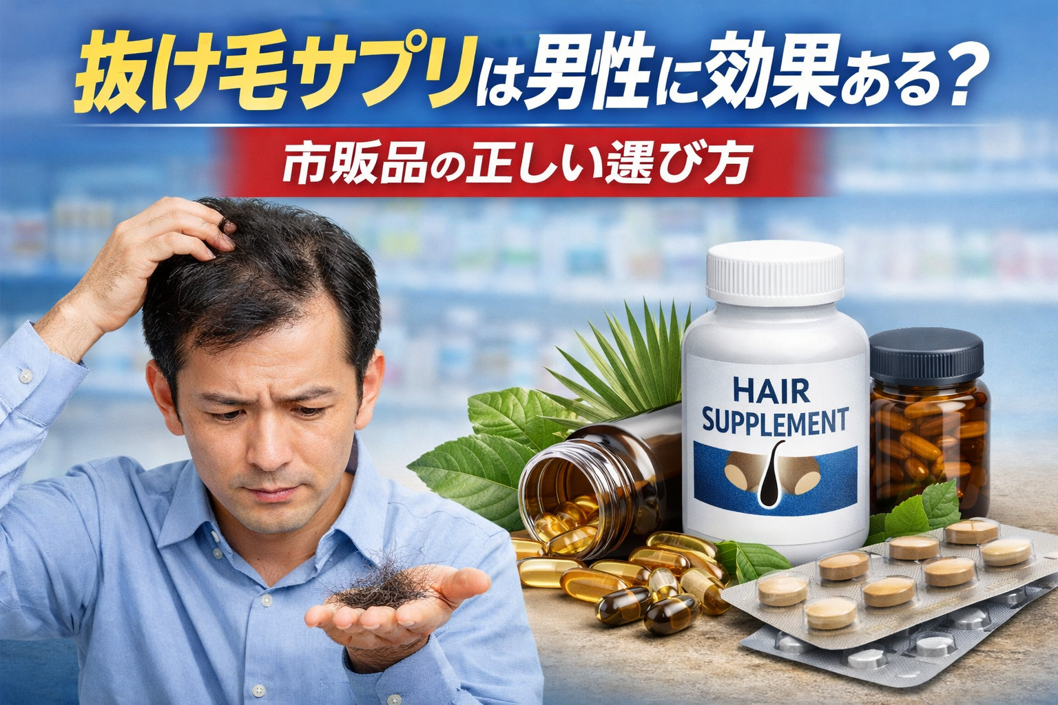 男性の抜け毛に悩む人は年々増加しており、ドラッグストアや通販サイトには数多くの「抜け毛対策サプリ」が並んでいます。