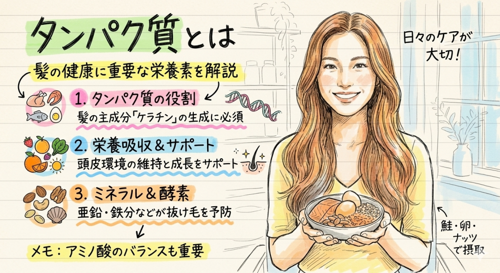 健康な髪を保つためには、タンパク質を含む栄養バランスの良い食事と生活習慣を整えることが重要です。
