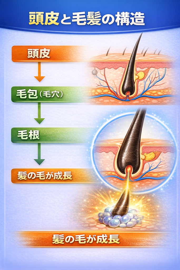 基本的には顔や体の皮膚と同じ構造を持っていますが、髪の毛が生える「毛包」と呼ばれる組織が多く存在する点が特徴です。