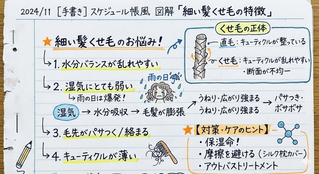 細い髪は一般的に髪の内部構造が弱く、水分を保持する力が強くありません。そのため、乾燥や湿気の影響を受けやすく、髪が広がりやすい傾向があります。